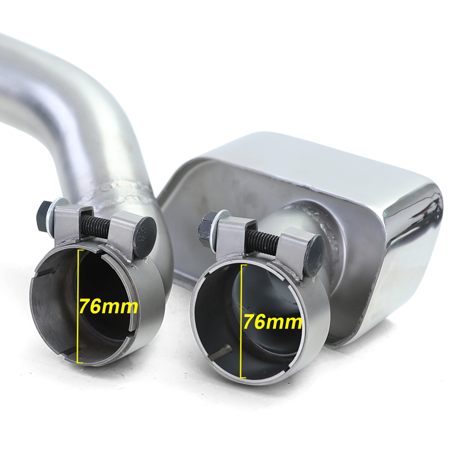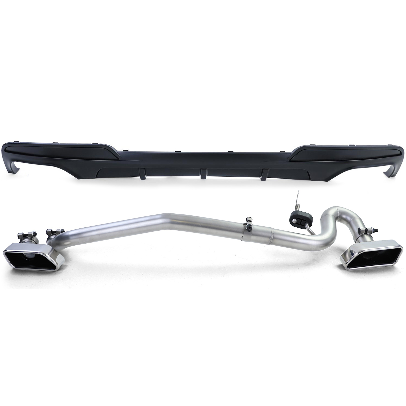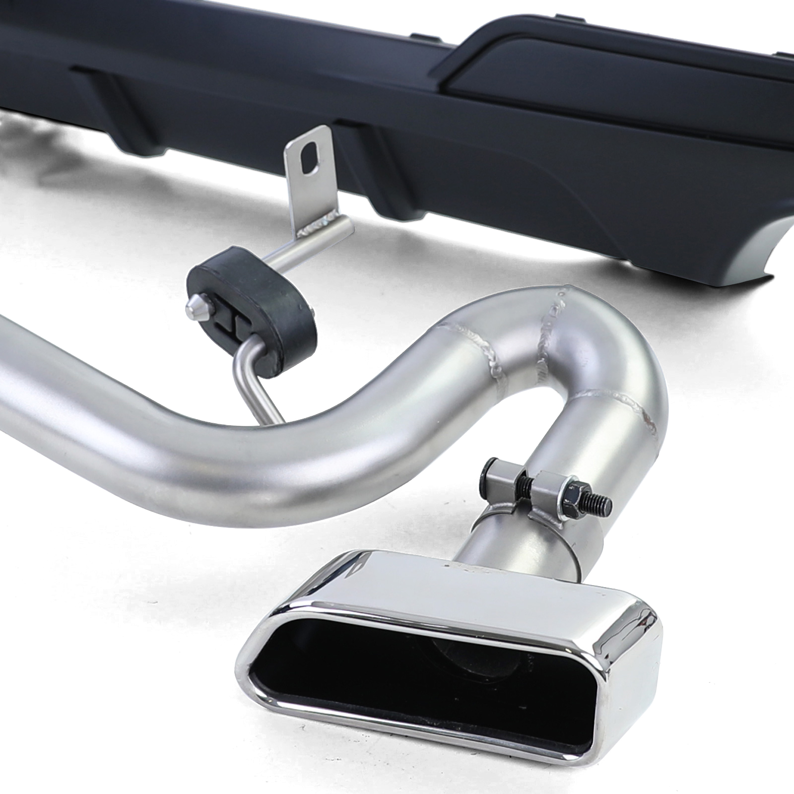 De set bevat een sportieve uitlaat ombouwset in V8-stijl met een hoekige uitlaat aan beide zijden van het voertuig, gemaakt van hoogwaardig roestvrij staal en inclusief bevestigingsmateriaal. Er is geen laswerk vereist omdat de afzonderlijke pijpen eenvoudig met elkaar worden verbonden door middel van bijgeleverde uitlaatklemmen. De set bevat ook een sportdiffusor in de performance-look, zwart mat van kleur, gemaakt van hoogwaardig ABS-kunststof met 100% perfecte pasvorm. Het oude diffusor is eenvoudig te vervangen door deze nieuwe diffusor, die volledig overschilderbaar is.