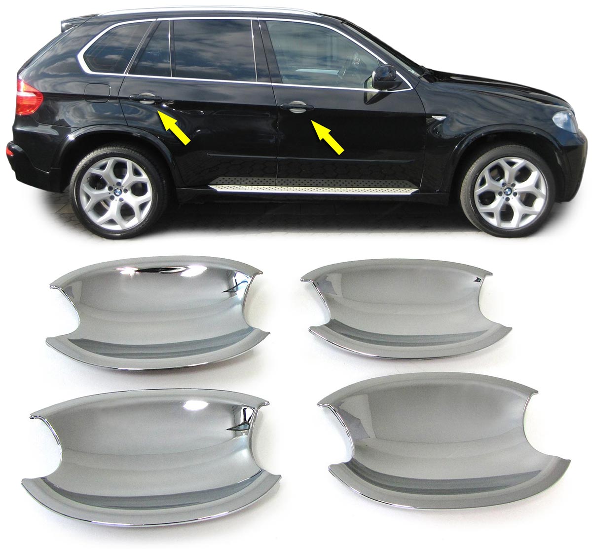 1 Set (für 4 Türen / 4-teilig) Türgriffmulden CHROM Technische Details/ passend für BMW X5 Typ E70 Bj. 2006 – 2010 X6 Typ E71 Bj. 2008 – 2014 3er Typ E90 / E91 Limousine / Touring Bj. 01/2005 – 06/2012